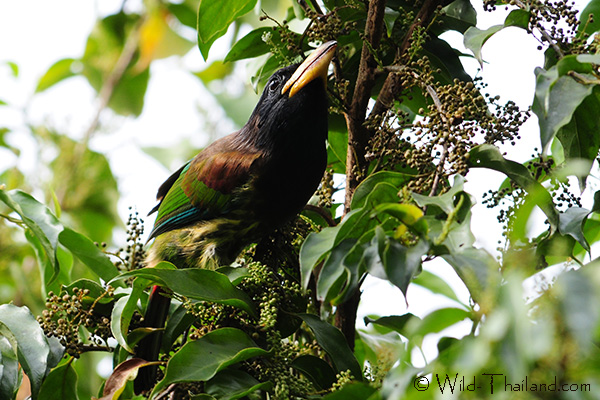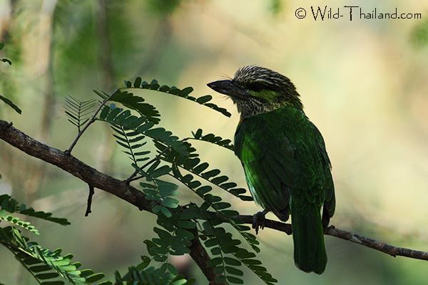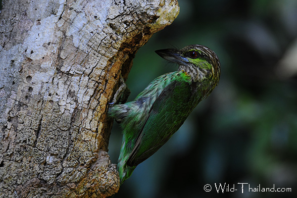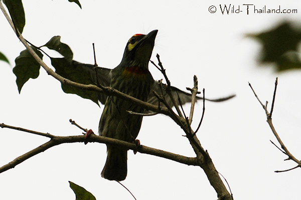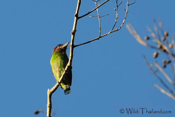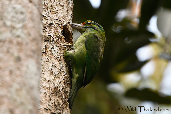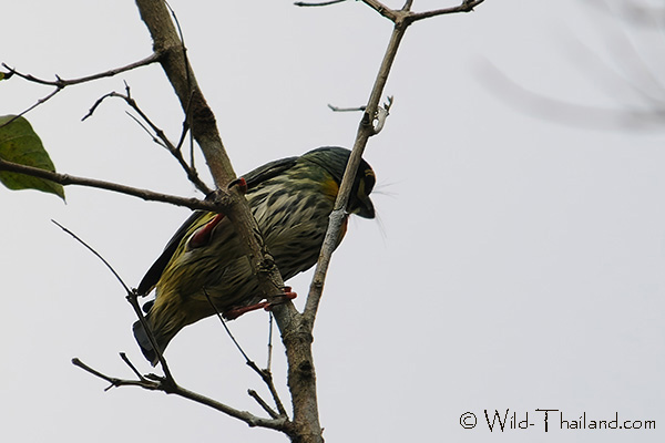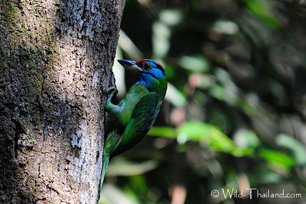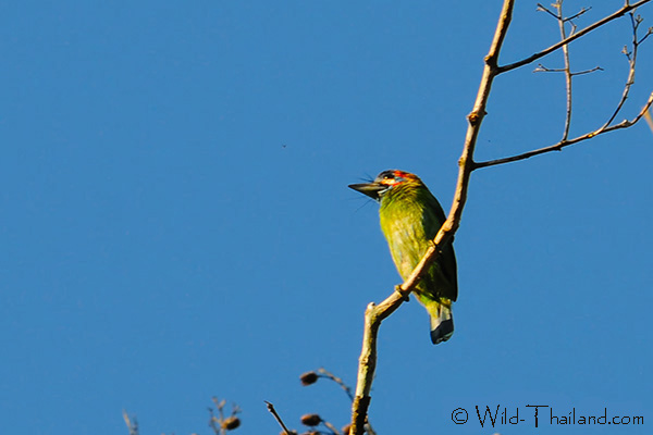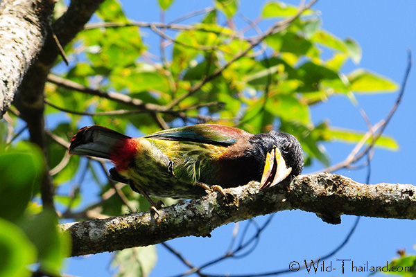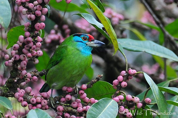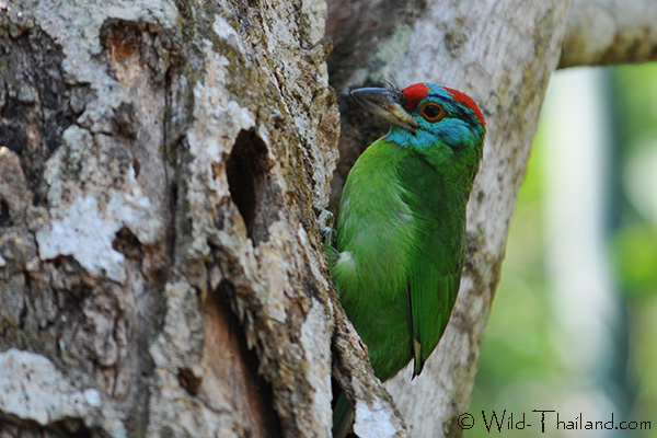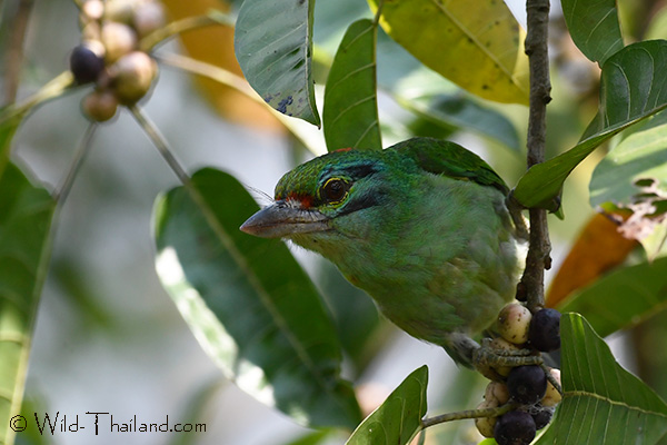 The blue-eared barbet is found throughout Thailand, inhabiting lowland and foothill forests up to 1600 meters.