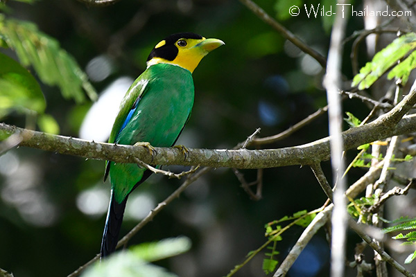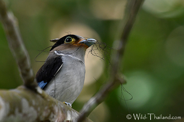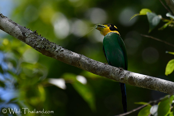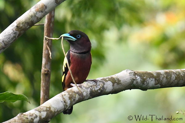 Long-tailed Broadbills are typically seen during the breeding season, either building nests or supporting the nest.