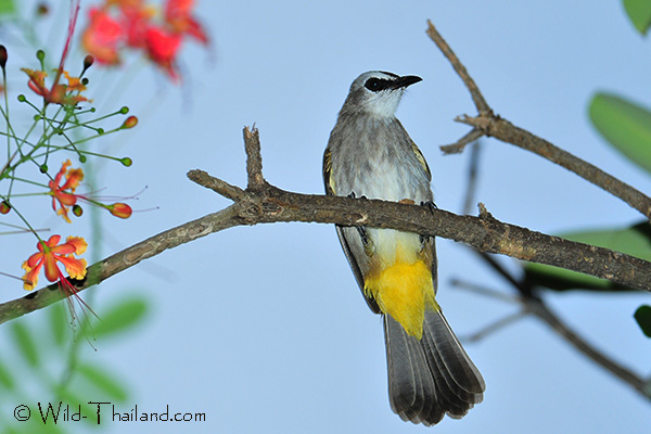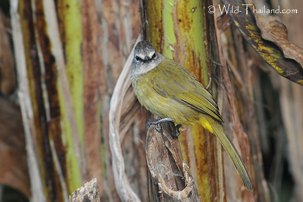 The Yellow-bellied Bulbul is a medium-sized bird with a bright yellow belly, a white throat, and a bluish-gray head.It has greenish upper parts. This species is easily recognisable by its lack of a crest and the sharp contrast between its white throat and grey face and head.