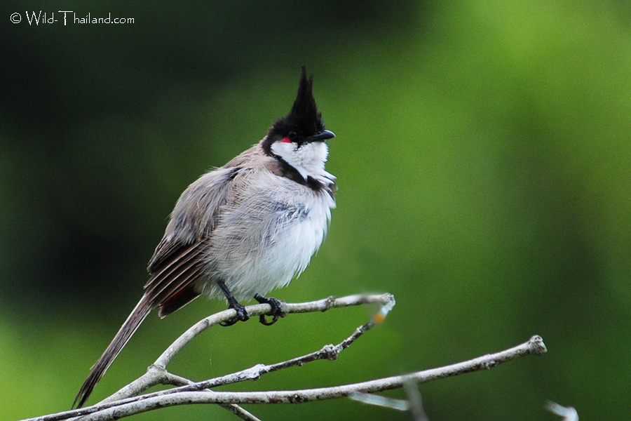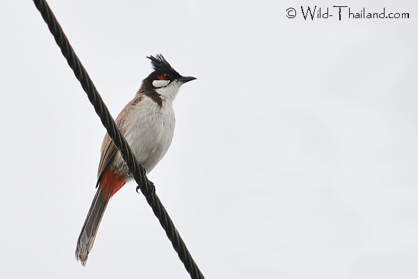 The Red-whiskered Bulbul is a medium-sized bird with a tall, pointed black crest, a red patch below the eye, and a black "moustache" line. It has brownish-black upper parts and whitish underparts with a buffy or reddish-orange vent area. Its long brown tail is tipped with white.