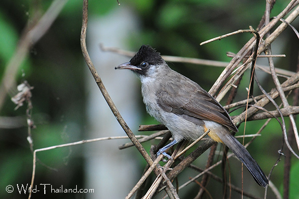 The Sooty-headed Bulbul is a medium-sized bird with a "sooty" black head, a pale brownish-grey back, and light-coloured underparts. It has a short crest, a white rump, and a distinctive bright red-orange vent under its tail.