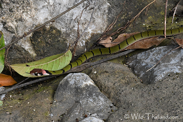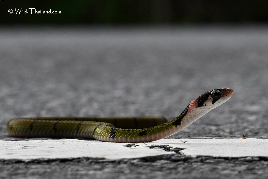 The Black-banded Keelback snake, is a shy, diurnal and semi-aquatic snake. Mild-mannered but defensive when threatened, it mimics cobras by flattening its neck and lifting its head, and can emit a foul odor, though it prefers to escape rather than bite.