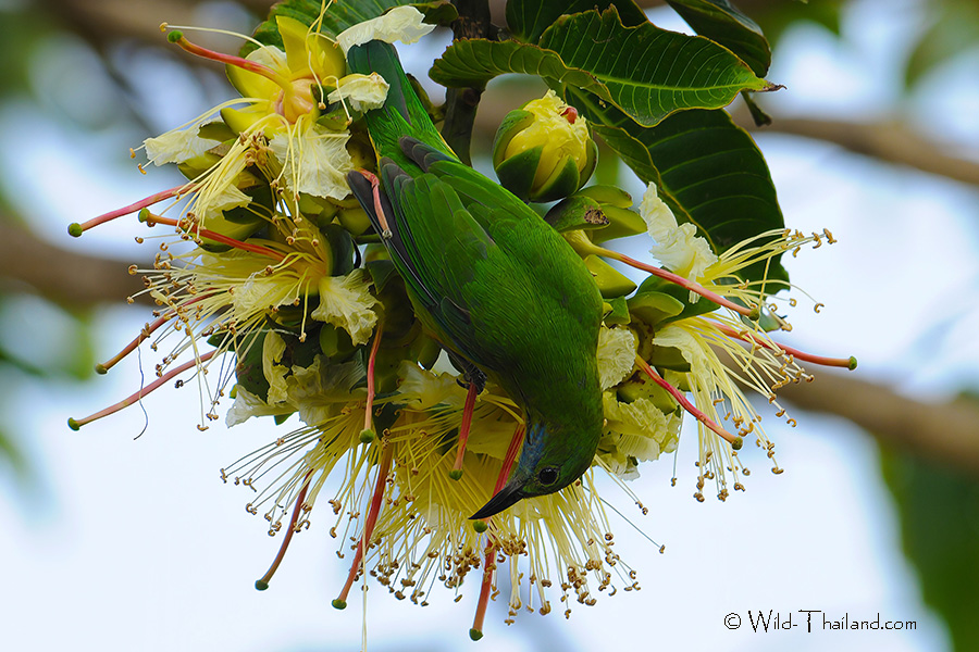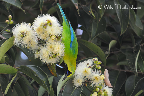 Blue-winged Leafbirds are often seen in flowering trees collecting nectar, or in fruit trees.