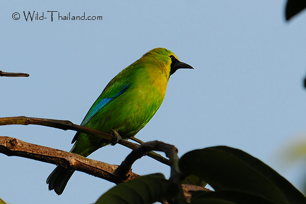 The Blue-winged Leafbird is found throughout Thailand, in dry dipterocarp forests and mixed deciduous forests, up to about 1,200 meters.