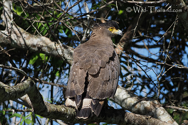 The Crested Serpent-Eagle is a stocky, medium-sized raptor with dark brown upper parts and paler, white-spotted underparts. It has a prominent, fan-shaped crest on its head, which appears almost black with white flecks when raised. It has a large head, broad wings, a short tail with conspicuous black and white bars, and yellow eyes, legs, and facial skin.