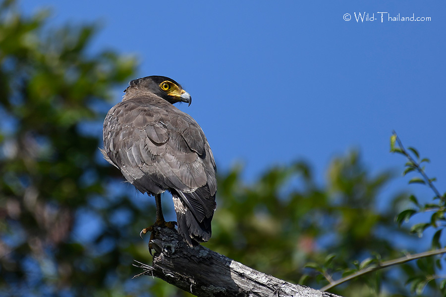 Crested Serpent-Eagles are solitary hunters, perching motionless on a high branch to scan for prey like snakes, small mammals, and birds.