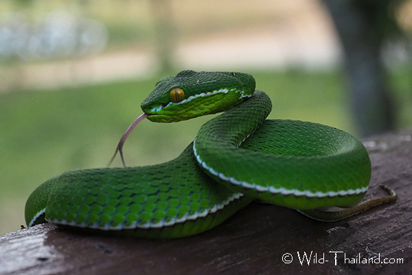 Bright green body, a distinct, pale, white or yellowish lip line, and a brownish-red tail. It has a broad, triangular head with vertical pupils, and males often feature a white stripe along their flanks, which is absent in females.