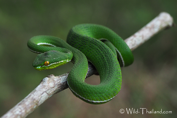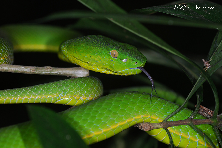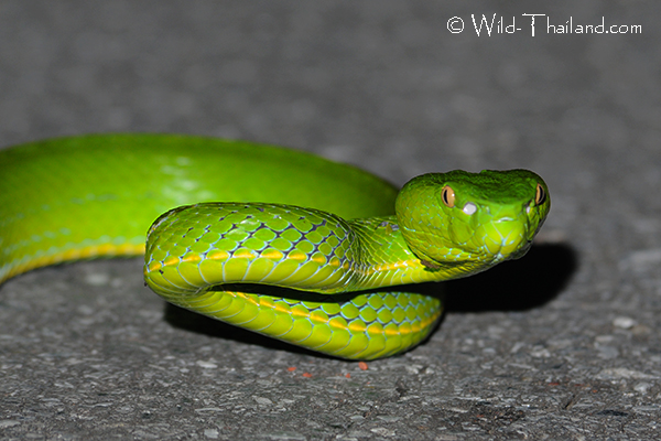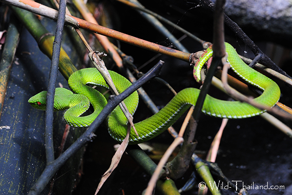 The Large-eyed Pit Viper is a slender, arboreal, nocturnal and venomous snake. known for its,,sit-and-wait ambush hunting strategy, relying on heat-sensing pits to detect prey. They are typically found in trees, using their prehensile tail for stability. They are generally slow-moving but capable of rapid strikes and, when threatened, can become aggressive.