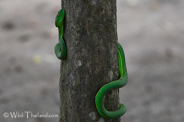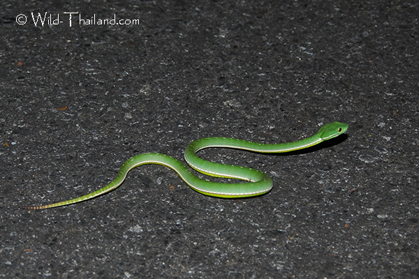 A slender, arboreal, green snake characterized by a distinct white or yellowish-white ventrolateral stripe on each side of the body.