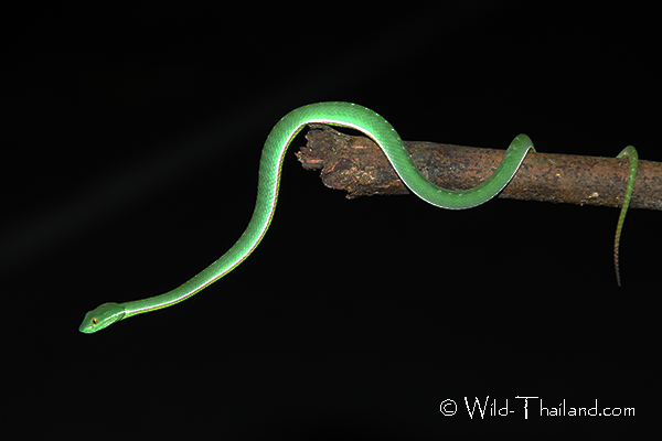 A slender, bright green, arboreal snake, with a distinct triangular head, deep red eyes, and a prehensile tail. They feature a pale, bicolored ventrolateral stripe (white and sometimes brown/orange) separating their vivid green top from a paler belly, often featuring red tips on their tails.